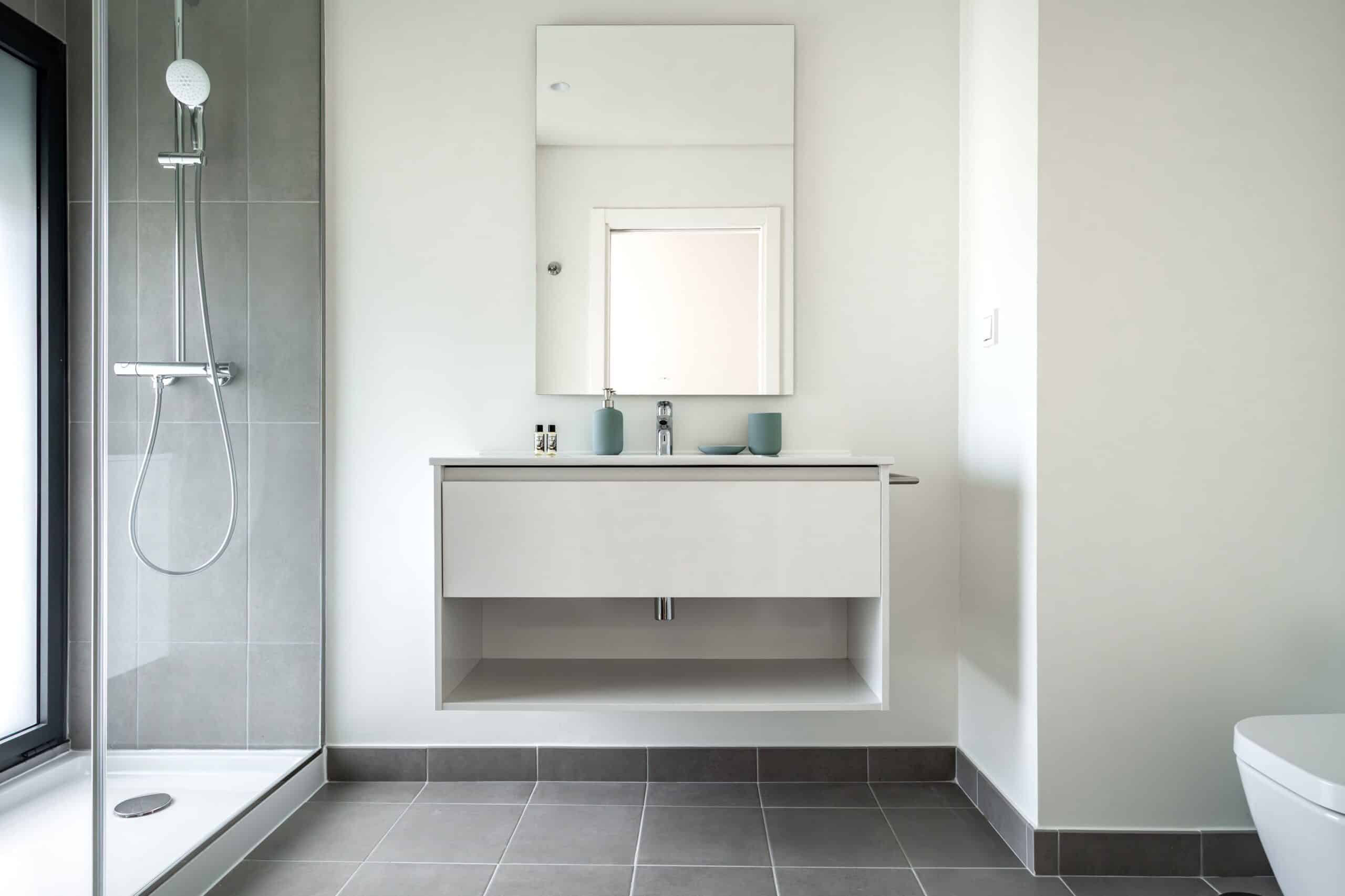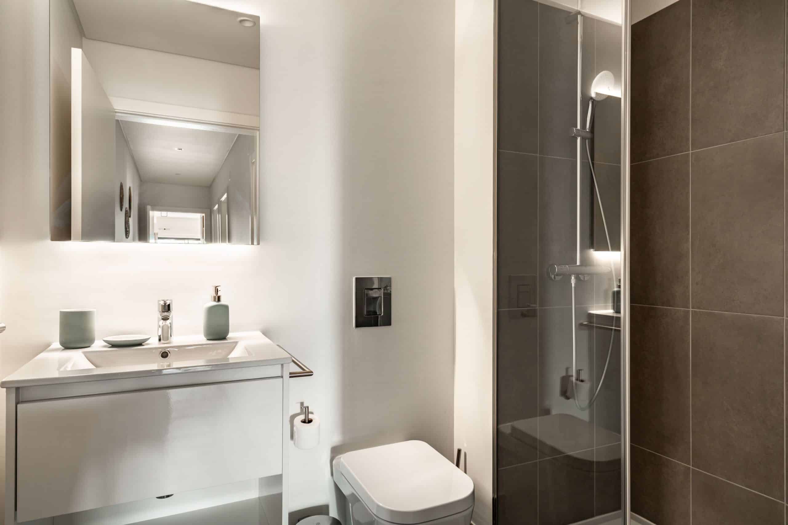A propriedade dispõe de 2,5 casas de banho no total. Isso garante privacidade e conveniência para todos os moradores. Há uma casa de banho de serviço perto da sala, além de duas casas de banho completas com duche – uma na suíte e outra acessível pelo corredor.